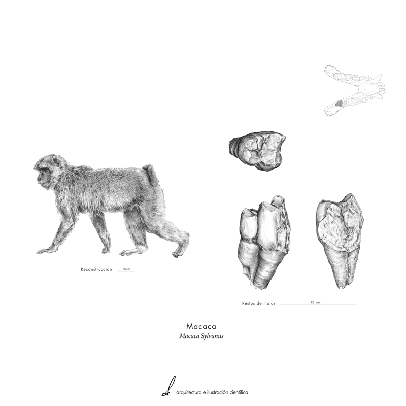 Lamina sobre la especie «Macaca sylvanus”. Se trata de una reconstrucción y dibujo en distintas vistas del fragmento de tercer molar inferior derecho del macaco de Berbería hallado en el yacimiento de Koskobilo, valle de la Burunda.